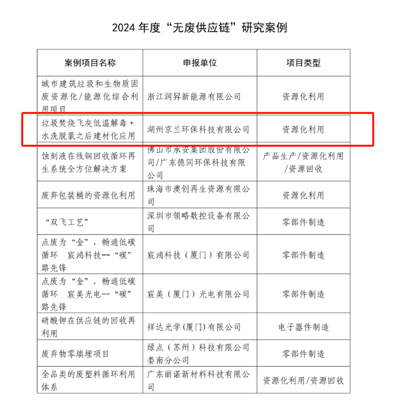 根據(jù)案例研究及匯報(bào)情況,本年度評(píng)選出10項(xiàng)“無廢供應(yīng)鏈”評(píng)價(jià)試點(diǎn)及10項(xiàng)“無廢供應(yīng)鏈”研究案例。湖州京蘭環(huán)??萍加邢薰緫{借 “垃圾焚燒飛灰低溫解毒 + 水洗脫氯之后建材化應(yīng)用” 項(xiàng)目脫穎而出,成功入選 “無廢供應(yīng)鏈” 研究案例。
